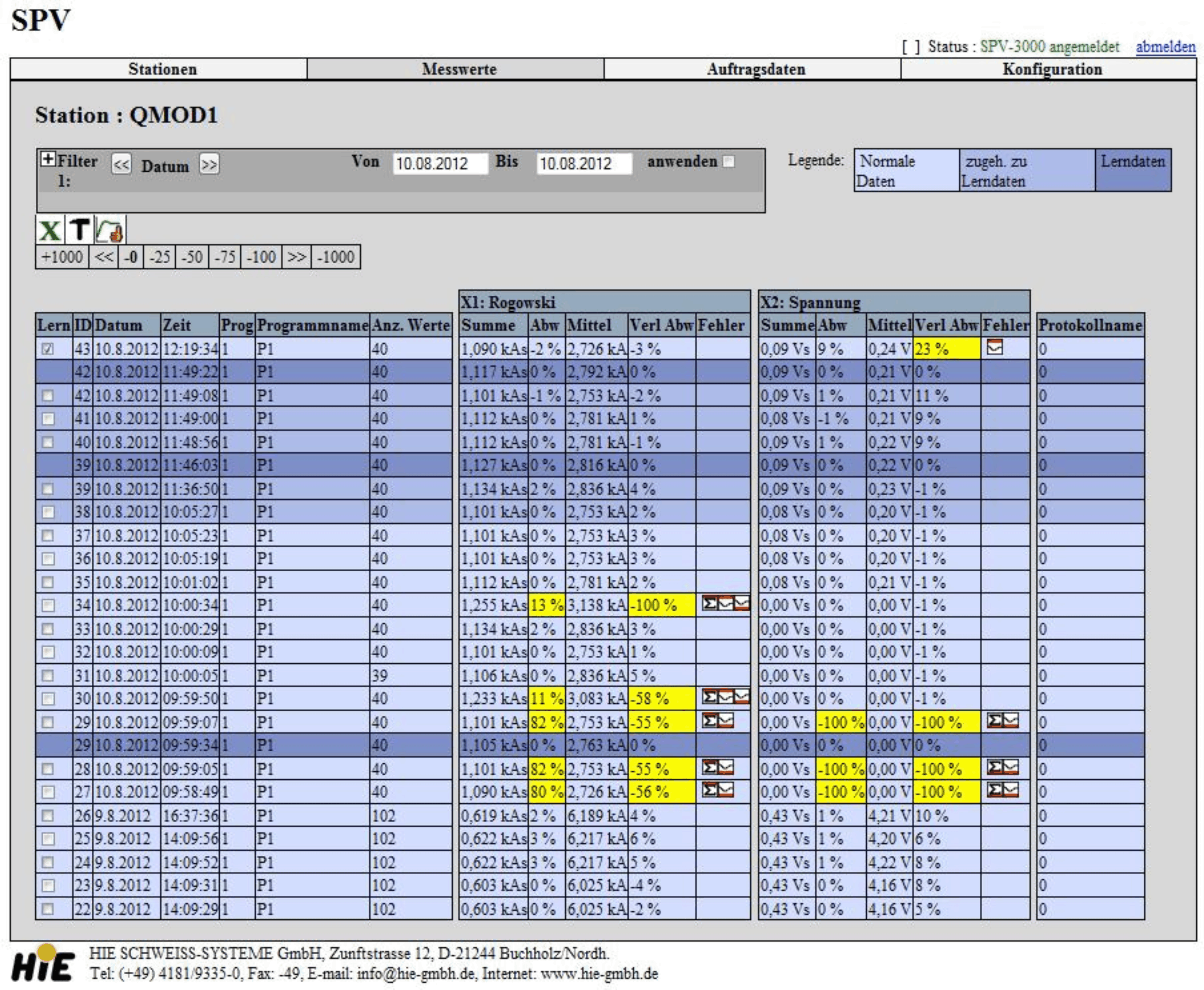 - Tabellenübersicht über die Mittelwerte pro Schweißung mit Soll- und Ist-Wert